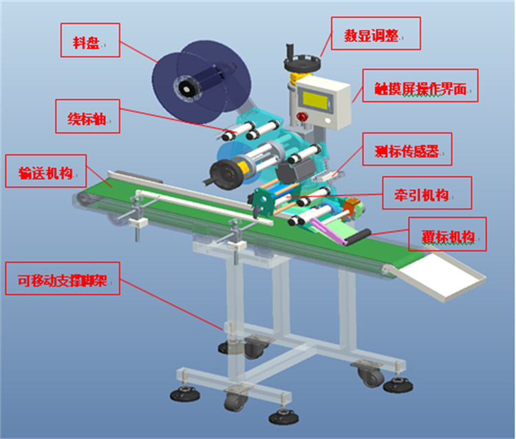 贴标精准,稳定性高:贴标效果好,精度+1mm:采用PLC+细分步进电机驱动送标,送标准确;采用凸轮式刹车机构,张力均匀,保证标带绷紧,减少标签拉断,确保标签检测[敏感词];标带绕行纠偏机构,防止标签左右偏移,保证出标精度;