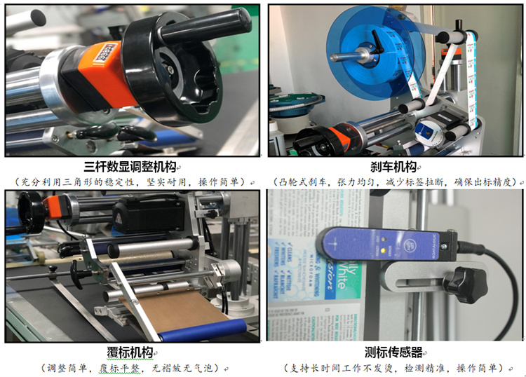 测标、测物电眼采用进口一线品牌传感器:检测灵敏度高,性能稳定,经久耐用;生产管理方便:具备贴标计数、省电模式、光电追踪标签等功能,生产管理更轻松;选材优良、品质过硬:本机型主要部件均采用不锈钢和高级铝合金板,刚性十足不变形、不生锈,美观天方;同时遵照 ISO9001质量管理体系制作,注重品质与用户使用体验,符合GMP优良制造标准;